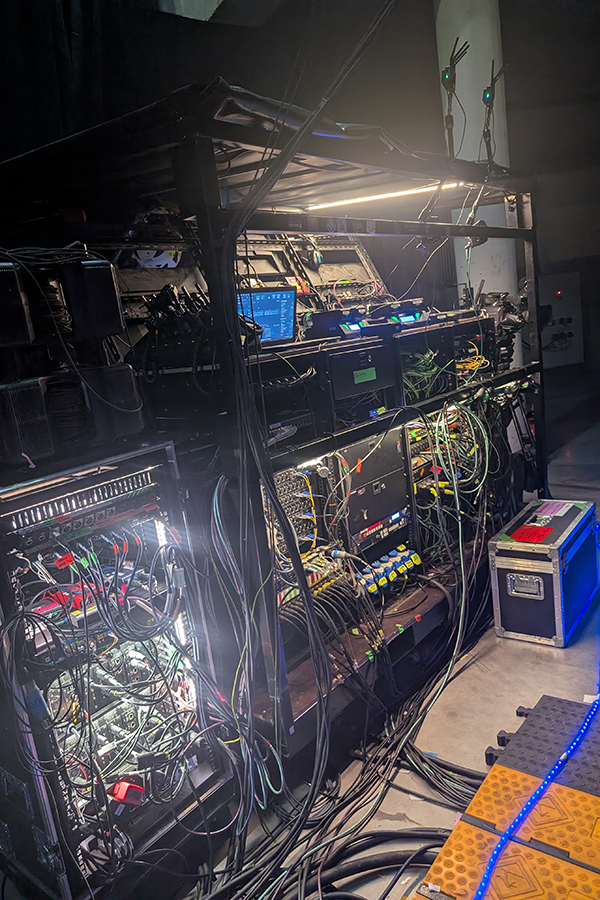 Antony nous dirige ensuite sur l’arrière de la scène, derrière l’écran et nous explique un tas de choses très intéressantes concernant le son, les lumières, le plafond lumineux, les images… Il y a des écrans partout, énormément de câbles, de boutons… C’est impressionnant !