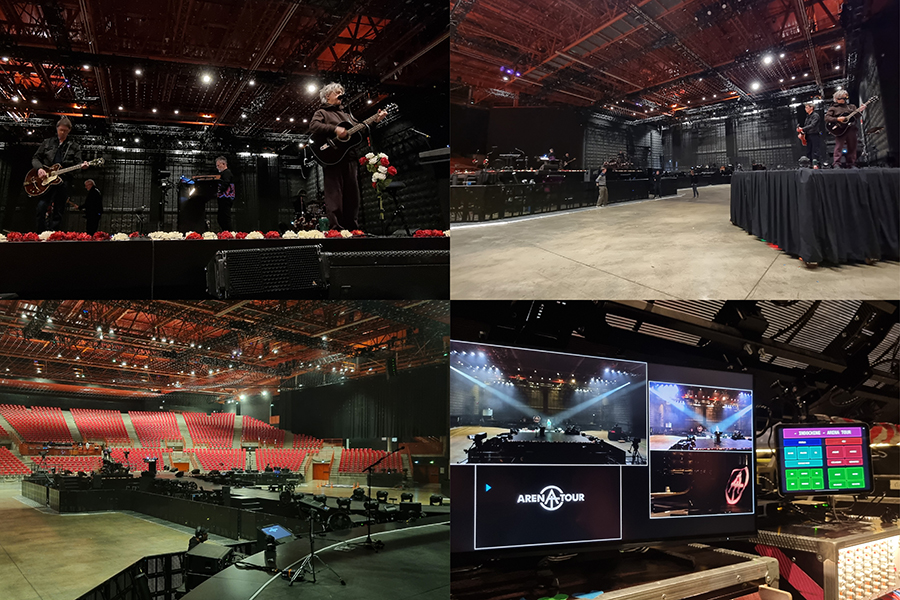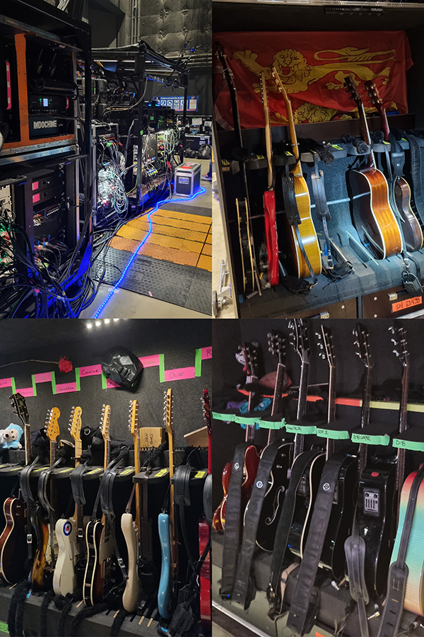 On descend, Antony nous dirige derrière l’écran géant, ça grouille de partout, les techniciens, la régie avec tous ces ordinateurs, les guitares !! Toutes ces guitares, qu’on voit de près, elles ont toutes des noms, on voit la guitare rainbow de Nicola, elle est tellement jolie.