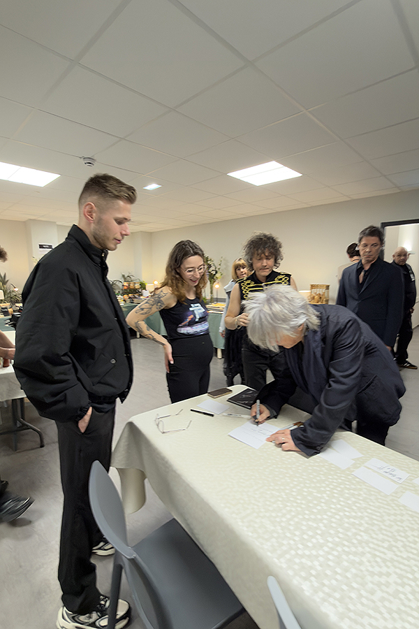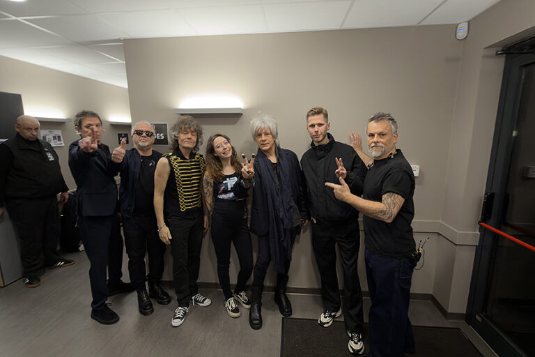 C’est à ce moment-là qu’ils arrivent, dans leur tenue de scène. Quelques échanges, Nicola me félicite pour ma grossesse, ce qui m’emplit de joie. Ils signent chacun leur tour mon petit carnet des Singles Collection. Le marqueur fuit, l’encre argenté se retrouve sur leurs mains. Les garçons en rigolent, se nettoient les doigts comme ils peuvent. On échange encore quelques mots avec eux, puis vient rapidement le moment de la photo de groupe immortalisée par Antony.