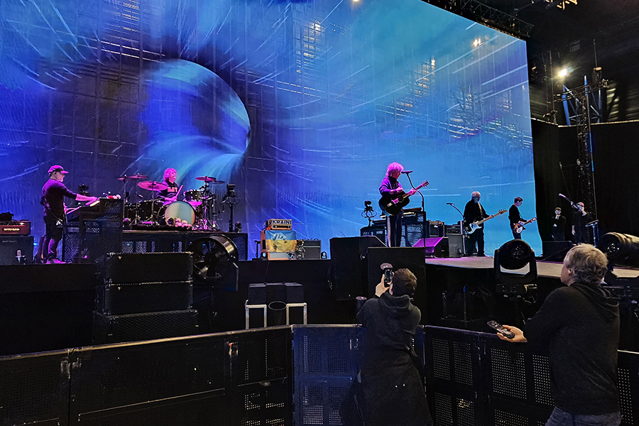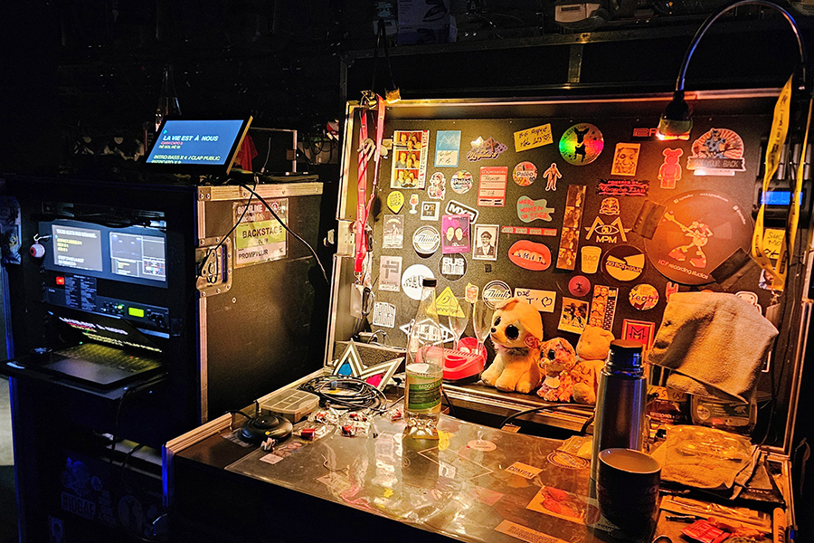 On y découvre les tables de mixage, tous les projecteurs cachés qui permettent à la scène d’être la plus minimaliste possible et de ne laisser vraiment que l’écran visible au public.