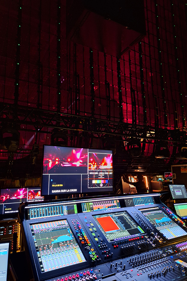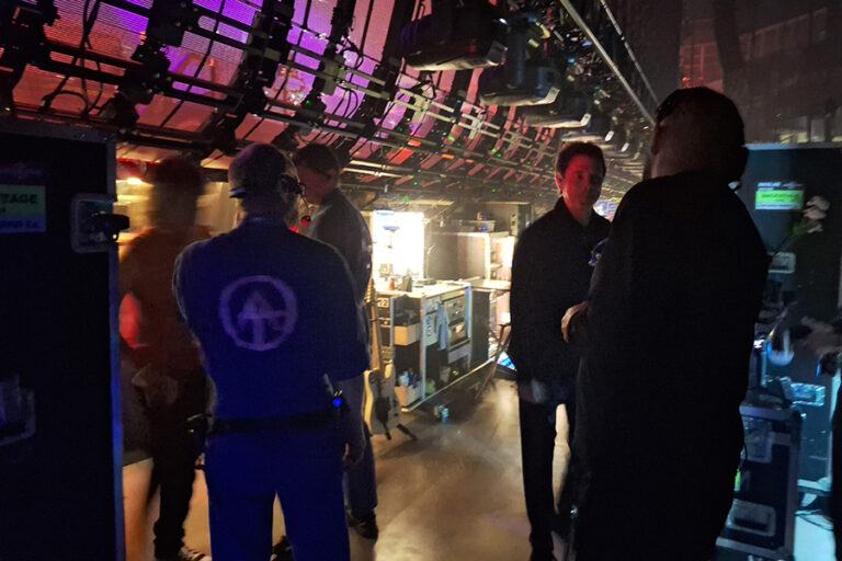 Nous passons derrière la scène et découvrons tout le matériel technique, les écrans de contrôle,