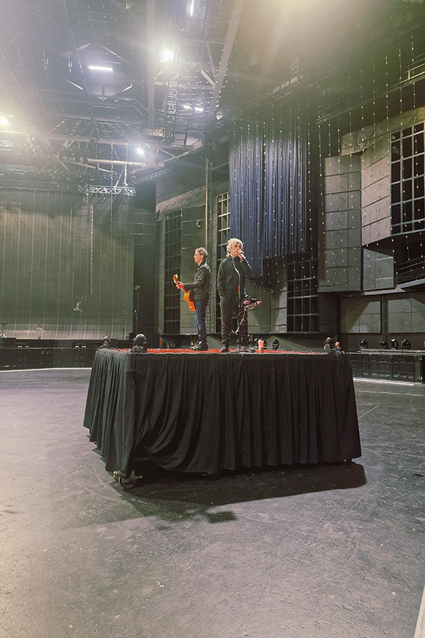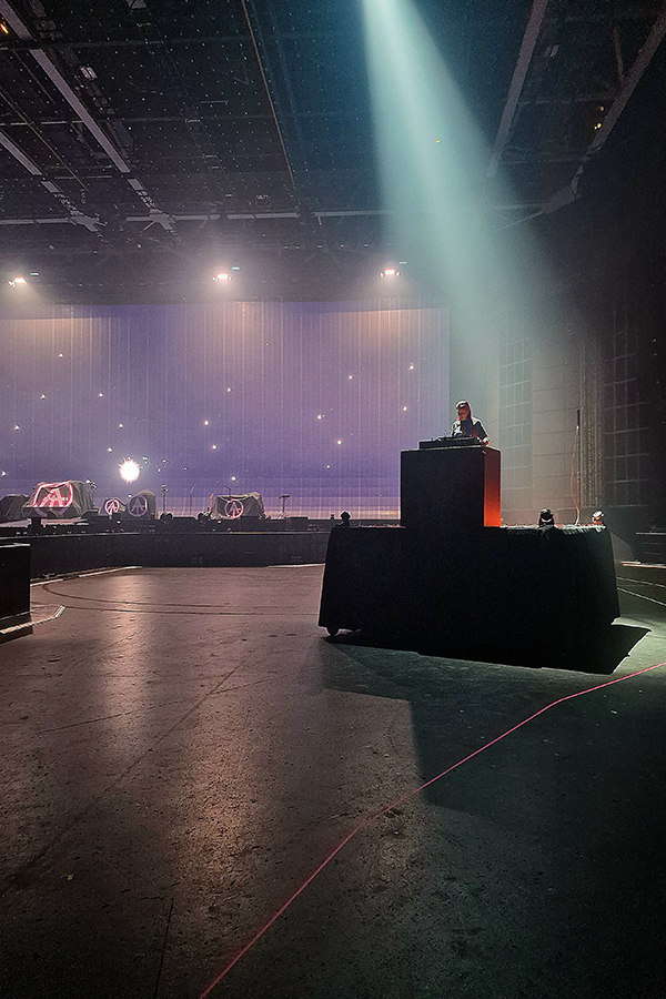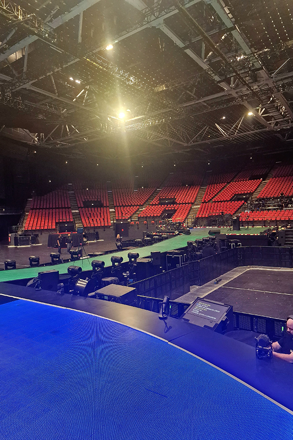 Une fois les balances terminées, nous avons le privilège de monter sur scène. La setlist de la soirée est déjà en place. Antony prend le temps de nous expliquer les aspects techniques de la scène : les écrans, les ventilateurs, les 12 000 LEDS installées au plafond, ainsi que les bracelets lumineux distribués au public. Il est passionné, et ses explications sont captivantes.