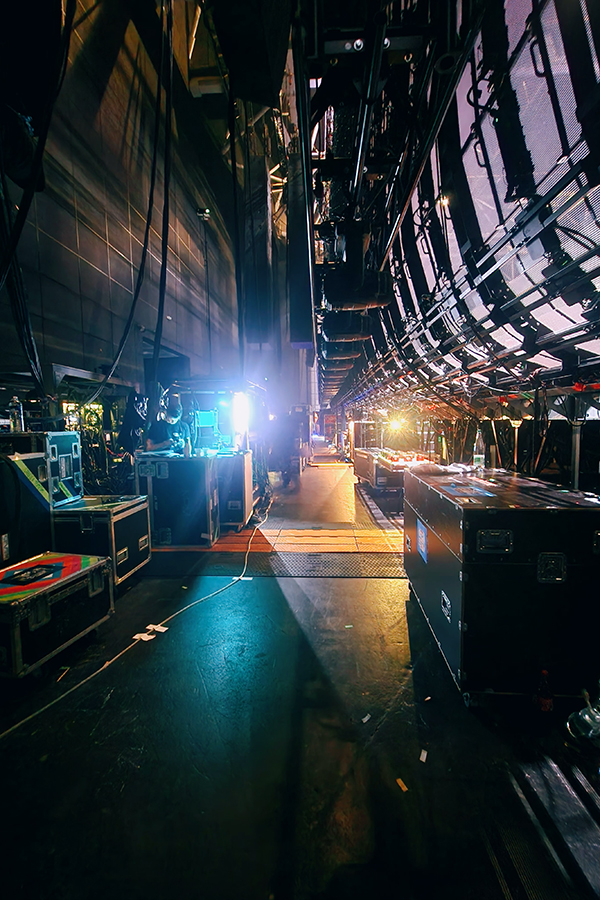 Après la photo de groupe, nous les accompagnons pour assister à leur montée sur scène depuis les backstages. Tout est parfaitement orchestré, chacun sait ce qu’il a à faire. oLi revient vers nous pour un dernier check… et le show peut commencer.