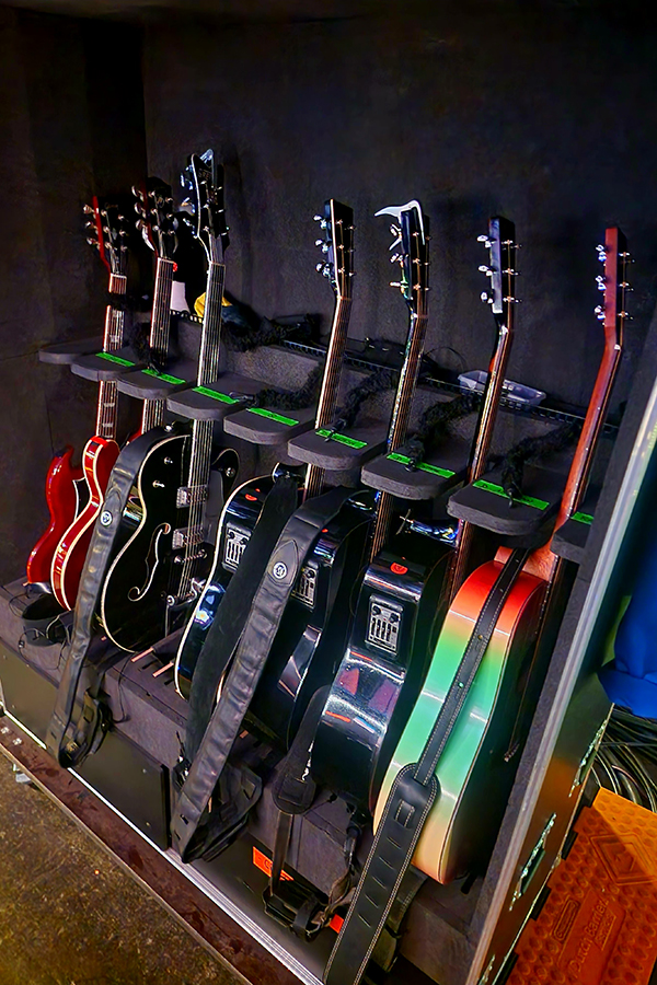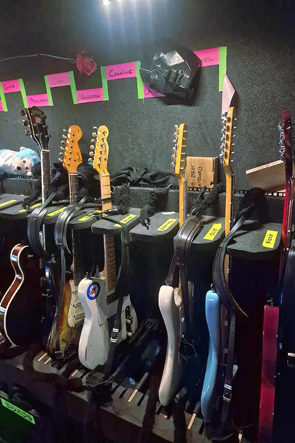 16h30 : Nous descendons dans les backstages où nous découvrons les guitares de Boris, oLi et Nicola, soigneusement rangées dans des flight-cases avec leurs noms inscrits dessus. Nous passons devant diverses consoles de son et d’écrans, avant de rentrer dans la loge express de Nicola, où on sent une agréable odeur d’encens. Un petit coin pour se changer, se recoiffer ou se restaurer, et un écran accroché en face pour suivre les événements en temps réel dans la salle.