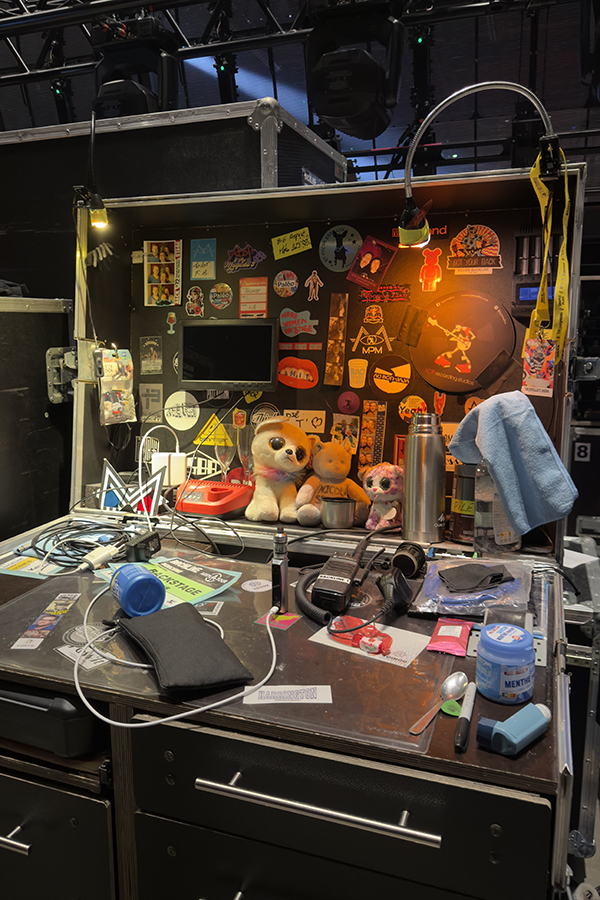 16h50 – Antony nous invite, à notre tour, à monter sur cette gigantesque scène. Le sol y est recouvert de milliers de LED. C’est impressionnant ! Le temps de faire quelques photos sur la scène, l’écran s’allume ! Juste magique ! Antony nous précise que l’écran fonctionne à seulement 20% de ses capacités. La nova au plafond est quant à elle composée de 12 000 LED, un dispositif unique au monde ! Direction l’arrière de la scène, où l’on y découvre tout le dispositif du son et des lumières, c’est titanesque. On passe devant les guitares de oLi, Marc, Boris et Nicola. Chacune des guitares a un petit nom, c’est fou ! Je m’arrête quelques secondes devant la guitare arc-en-ciel de Nico (je n’en crois pas mes yeux de la voir d’aussi près…). Puis, on est invité à entrer dans la petite loge rapide de Nicola.