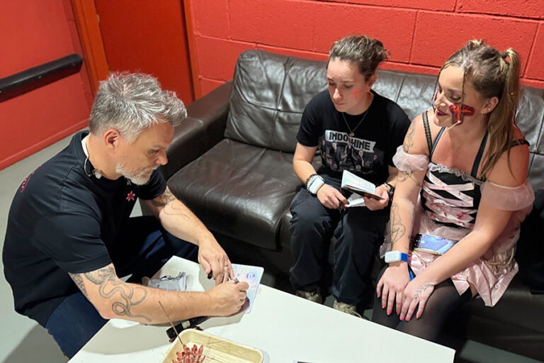18h30 – Les portes s’ouvrent, les premiers fans courent vers la fosse. Antony nous précise qu’il viendra nous chercher à 20h25 pour aller rencontrer le groupe.