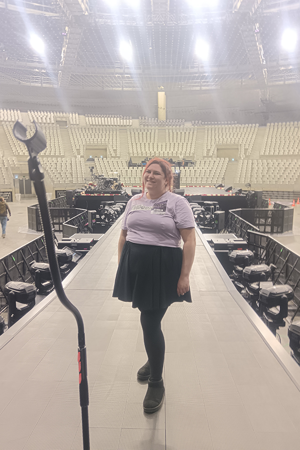 Des techniciens mettent des bâches ornées du logo Arena Tour sur les instruments afin de les protéger jusqu’au concert. Nous marchons sur un sol jonché de LEDs qui s’illumineront pendant le show comme une continuité de l’écran géant au fond de la scène.