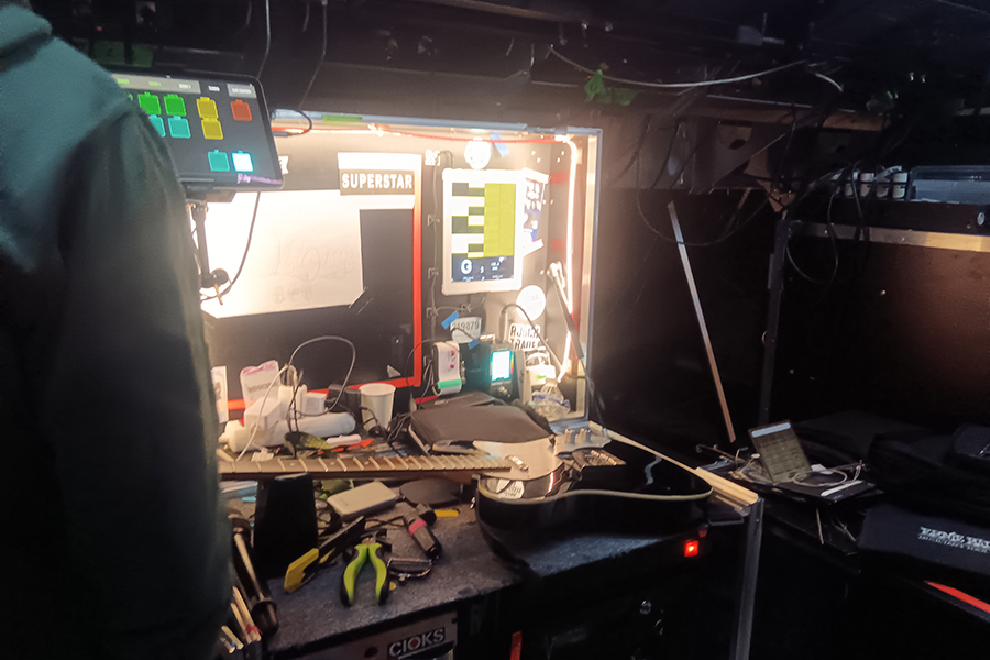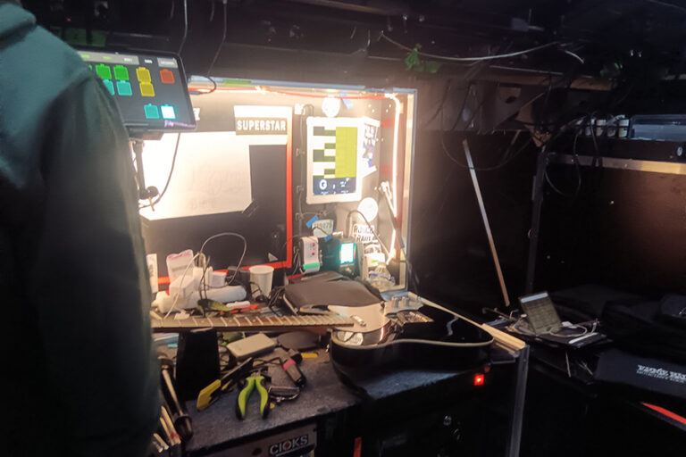 Nous découvrons aussi que les réglages des instruments sont pré-programmés chanson par chanson derrière l’écran, ce qui permet d’être fluide pendant le spectacle.