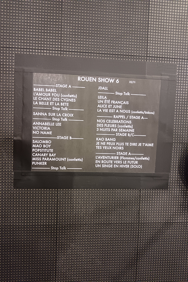 Les membres montent un à un sur scène tandis que résonne l’intro de Babel Babel. Pour terminer, Nicola sort de sa loge rapide et prend quelques secondes pour respirer avant de se lancer à son tour.