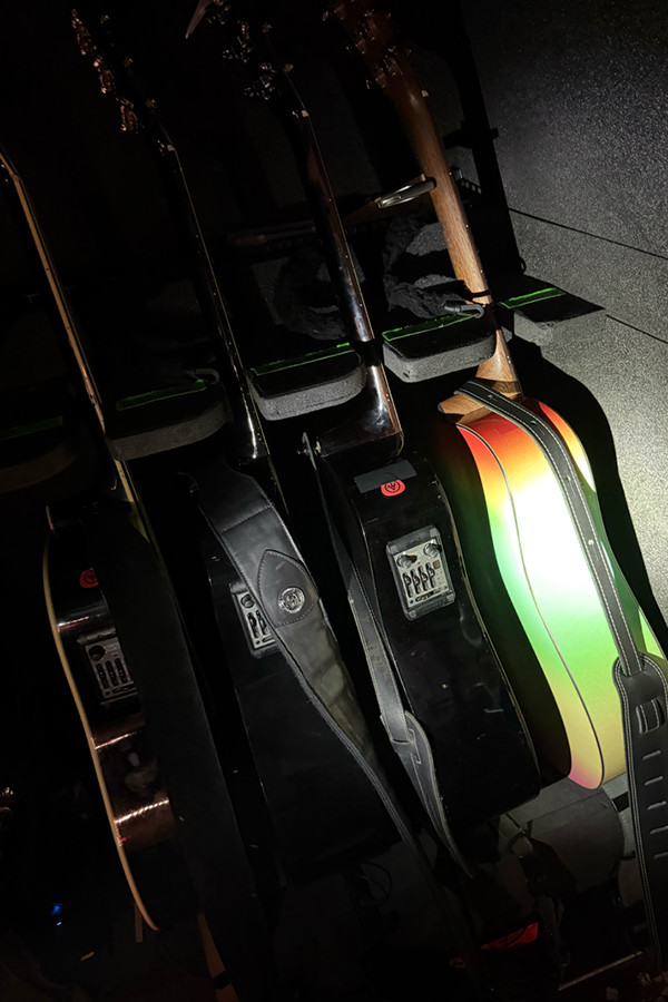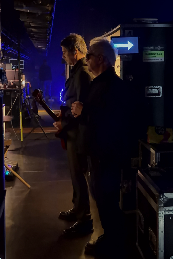 Puis nous passons à l’arrière de l’écran : (surprise en croisant Boris au passage) je m’émerveille devant les guitares, les micros, la régie, la loge rapide de Nicola…