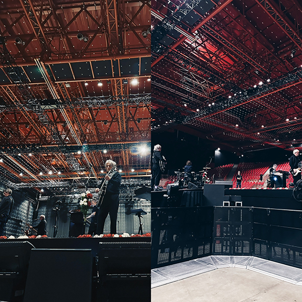 Pendant plus de 30 minutes, on regarde le groupe répéter. On se déplace dans la salle pour avoir plusieurs points de vue. Ça fait bizarre de voir la salle entièrement allumée : la scénographie paraît encore plus grandiose qu’à l’ouverture des portes, quand les lumières sont plus sombres.