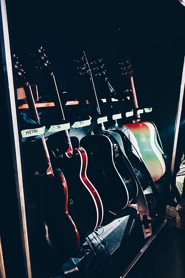 Je découvre tout ce qui permet au show de fonctionner pendant presque 2h30 chaque soir : les guitares de Boris (et les petits noms qu’il leur donne), celles de Nicola et d’oLi, les basses de Marco.